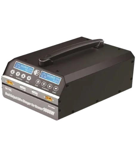 The SkyRC PC1080 dual-channel charger delivers up to 1080W total output with 20A max current per channel, supporting fast and balanced charging of LiPo/LiHV batteries, ideal for industrial and drone applications.